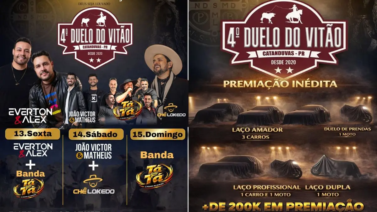 Entre os dias 11 e 15 de março de 2026 acontece em Catanduvas a quarta edição do Duelo do Vitão, evento tradicional do laço que reúne competidores de várias regiões e oferece uma premiação superior a 200 mil reais.