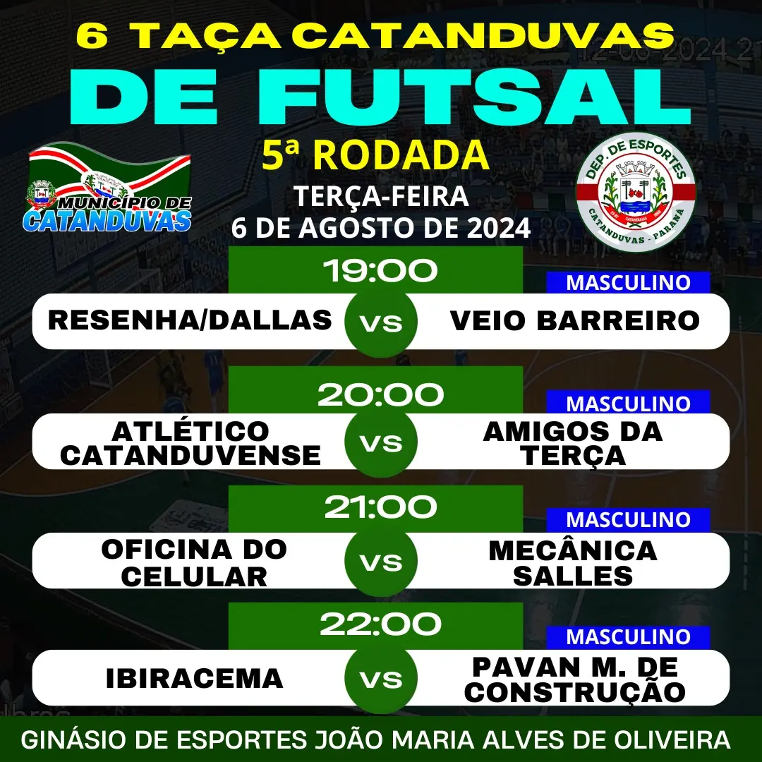 Será realizada na noite desta terça-feira (6), a 5ª rodada da 6ª Taça Catanduvas de Futsal Feminino e Masculino, no Ginásio de Esportes João Maria Alves de Oliveira. Confira os confrontos da noite: