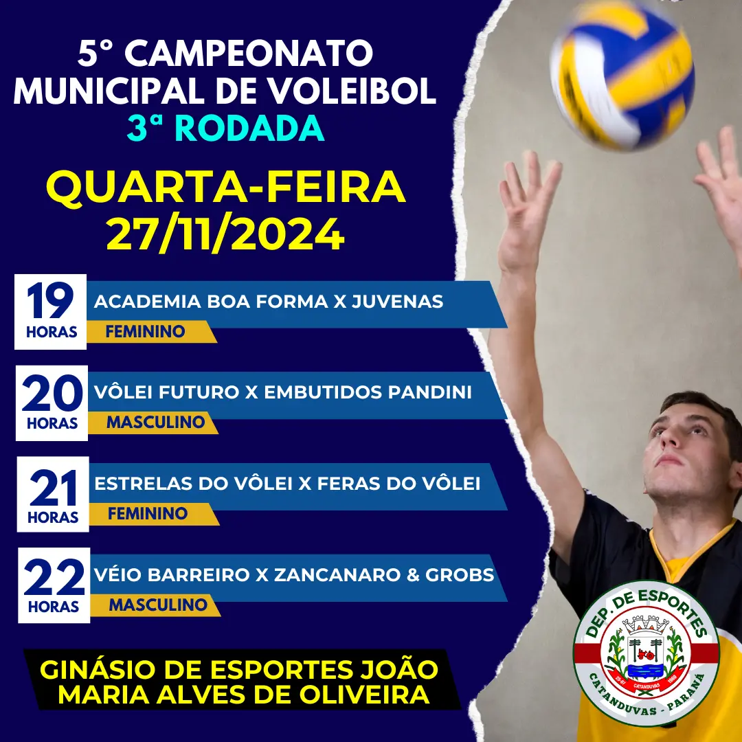 Nesta quarta-feira, dia 27 de novembro de 2024, o Ginásio de Esportes João Maria Alves de Oliveira, em Catanduvas do Paraná, será palco da 3ª rodada do 5º Campeonato Municipal de Voleibol. A rodada contará com quatro partidas, sendo dois confrontos femininos e dois masculinos.