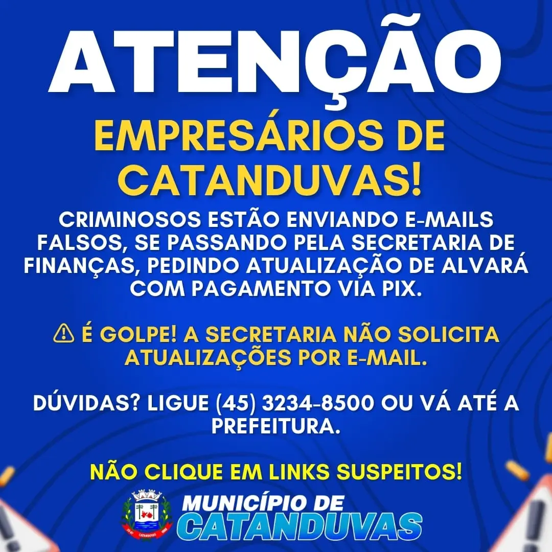 Empresários de Catanduvas estão sendo alvo de um novo golpe envolvendo falsos e-mails supostamente enviados pela Secretaria Municipal de Finanças. Os criminosos utilizam uma comunicação falsa, informando que o empresário precisa atualizar ou regularizar seu alvará.