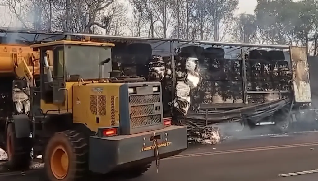 Conforme a PRF, o motorista informou que seguia pela rodovia, percebeu incêndio na vegetação e parou. Acredita-se que o fogo às margens da rodovia atingiu o caminhão.