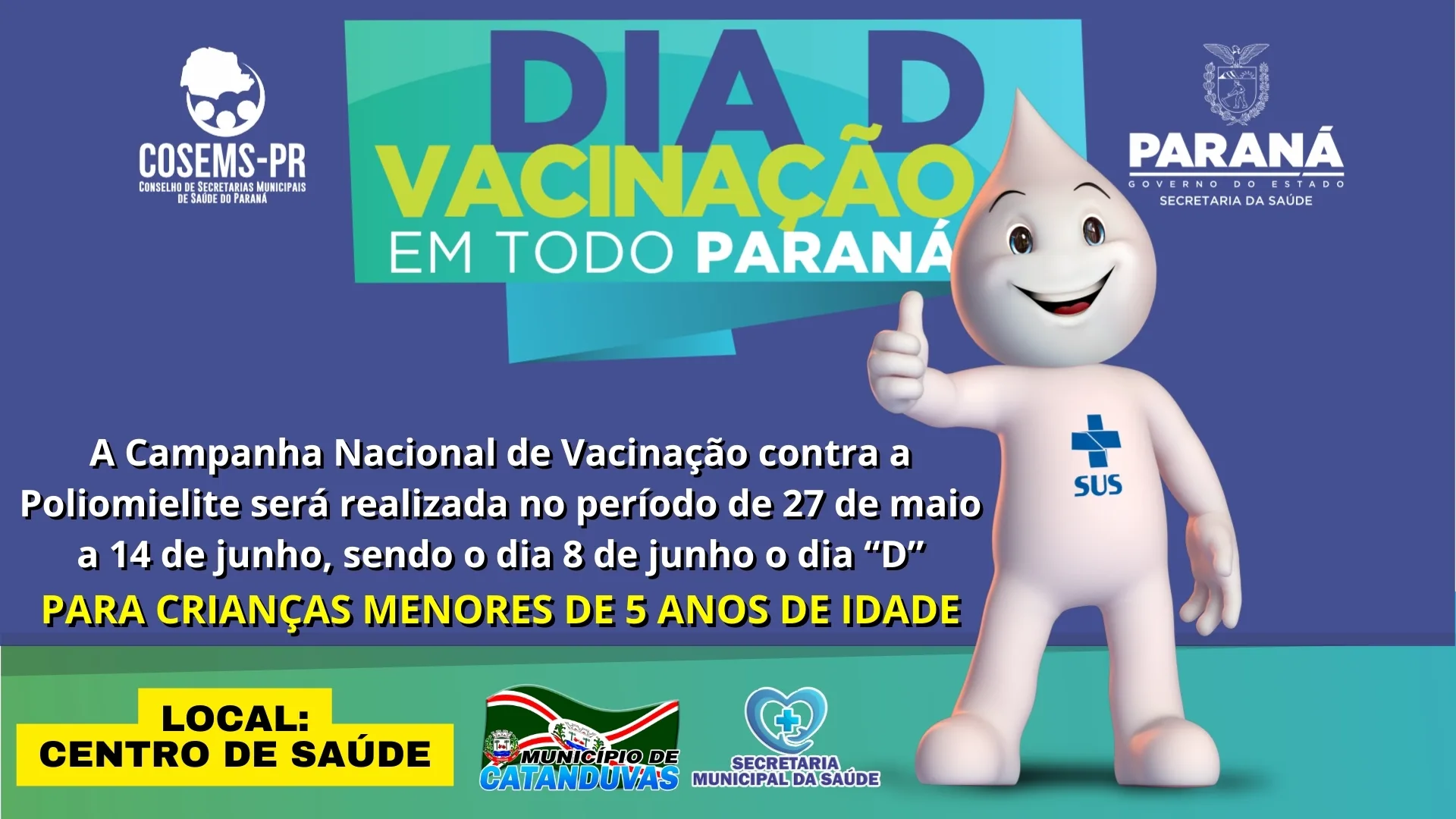A Secretaria de Saúde do Estado do Paraná, em parceria com o Conselho de Secretarias Municipais de Saúde do Paraná (COSEMS-PR), anuncia a Campanha Nacional de Vacinação contra a Poliomielite. Esta importante campanha será realizada do dia 27 de maio ao dia 14 de junho. Marque na sua agenda, pois o Dia D de vacinação será no dia 8 de junho.