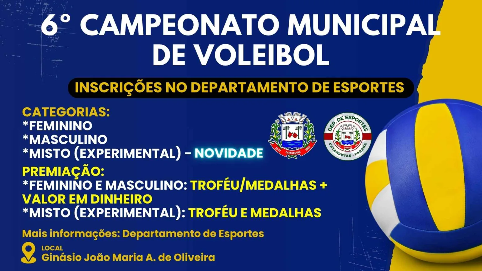 O Departamento de Esportes da Prefeitura de Catanduvas informa que estão abertas as inscrições para o 6º Campeonato Municipal de Voleibol. A competição contará com as categorias Feminino, Masculino e Misto (Experimental).
