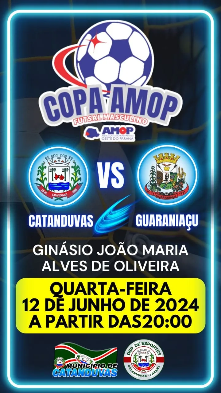 Nesta quarta-feira, 12 de junho de 2024,o Ginásio João Maria Alves de Oliveira será palco de mais uma partida emocionante da Copa AMOP de Futsal Masculino, onde Catanduvas enfrente Guaraniaçu, a partir das 20h.