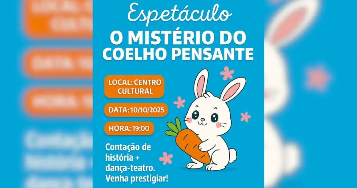Catanduvas vai receber um espetáculo especial voltado para toda a família. Na próxima sexta-feira, dia 10 de outubro de 2025, o Centro Cultural será palco da apresentação “O Mistério do Coelho Pensante”, que promete encantar crianças e adultos com muita arte, imaginação e diversão.