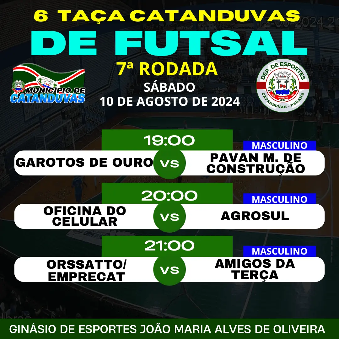Três confrontos serão realizados na noite de sábado (10), no Ginásio de Esportes João Maria Alves de Oliveira, todos os jogos válidos pela 7ª rodada da 6ª Taça Catanduvas de Futsal Feminino e Masculino, confira: