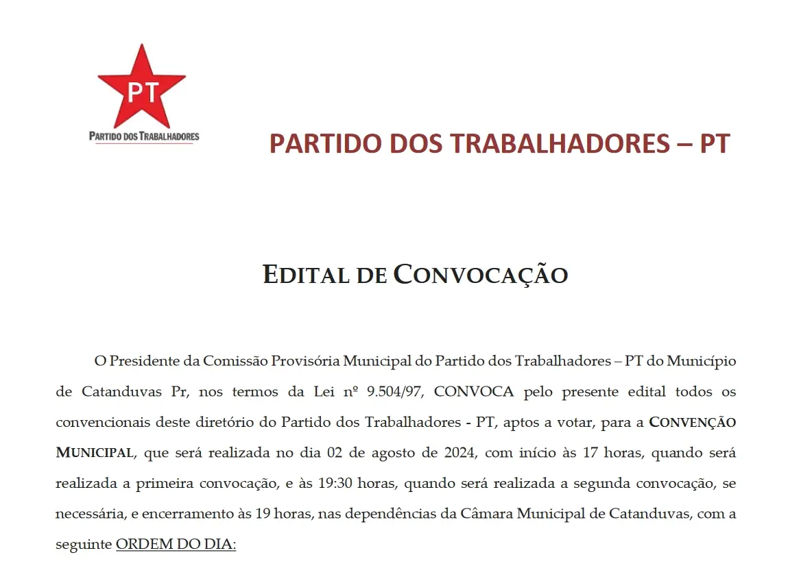 O Partido dos Trabalhadores – PT de Catanduvas divulgou nesta segunda-feira, 22 de julho de 2024, o edital de convocação para todos seus os convencionais, aptos a votar, para participarem da Convenção Municipal, que será realizada no dia 2 de agosto, a partir das 17h, nas dependências da Câmara Municipal.