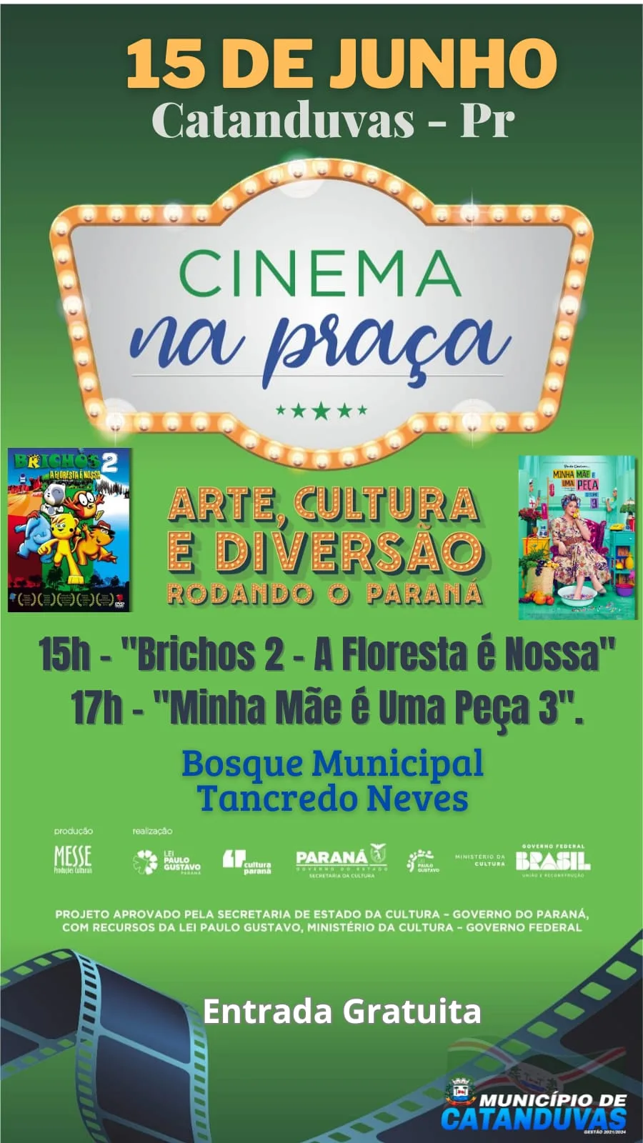 Neste sábado, dia 15 de junho, o “Cinema na Praça” estará em Catanduvas, para a exibição gratuita de dois filmes sendo eles: “Brichos 2 – A Floresta é Nossa” e “Minha Mãe é Uma Peça 3”.