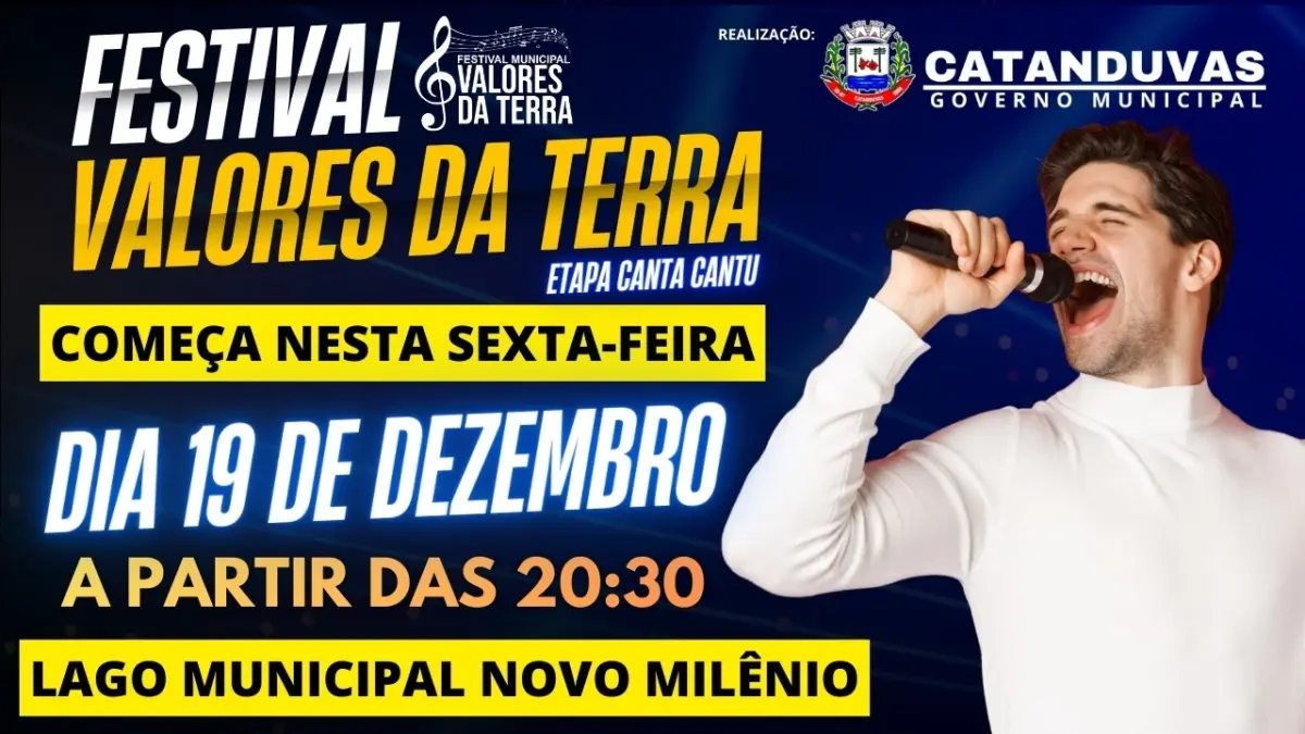 O Festival Municipal Valores da Terra começa nesta sexta-feira, dia 19 de dezembro, em Catanduvas. A programação tem início a partir das 20h30, no Lago Municipal Novo Milênio.