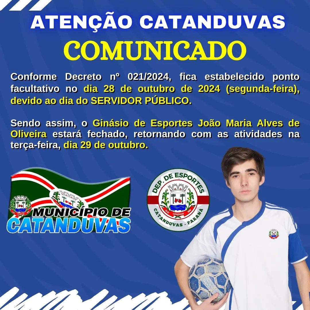 Conforme o Decreto nº 021/2024, a Prefeitura de Catanduvas estabeleceu ponto facultativo na segunda-feira, 28 de outubro de 2024, em comemoração ao Dia do Servidor Público.