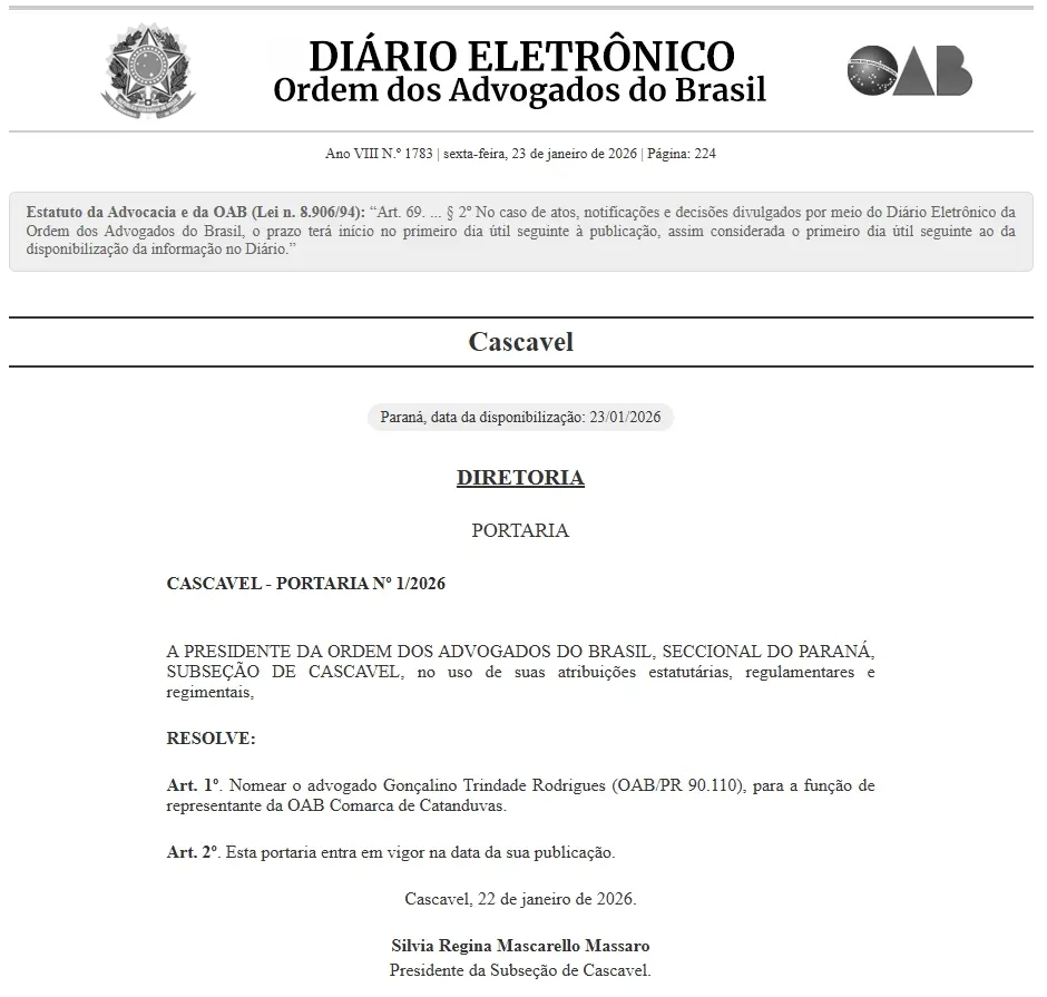 A Ordem dos Advogados do Brasil oficializou a nomeação do advogado Gonçalino Trindade Rodrigues como representante da OAB na Comarca de Catanduvas. A decisão consta na Portaria nº 1/2026, publicada no Diário Eletrônico da OAB na sexta-feira, 23 de janeiro de 2026.