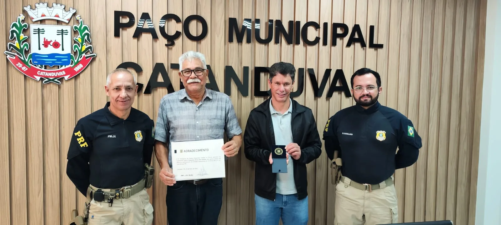 A Administração Municipal de Catanduvas, por meio do prefeito Professor Moisés e do secretário de administração, Francisco Alves dos Santos (Chico Viola), recebeu a Moeda Institucional da Polícia Rodoviária Federal (PRF) e o certificado de agradecimento pela parceria mantida em benefício da área da segurança pública e pelos resultados positivos na atuação do serviço público.