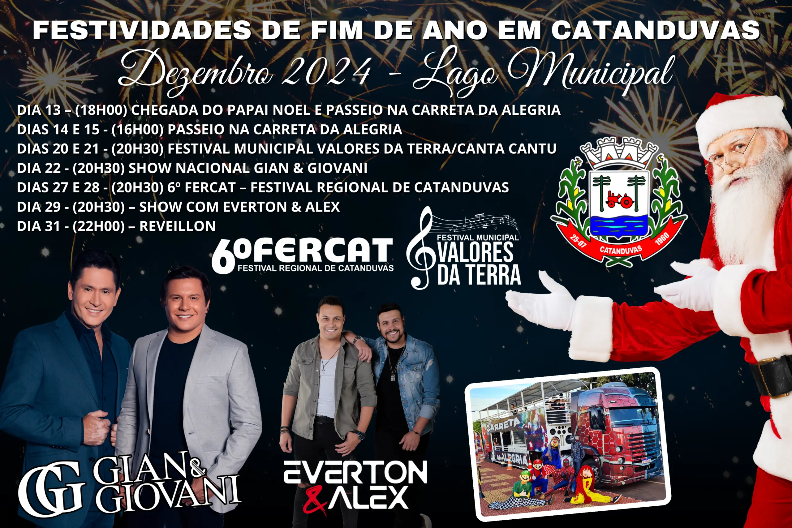 Essa programação é uma iniciativa da Prefeitura de Catanduvas, com o objetivo de promover cultura, lazer e integração social. Não perca a oportunidade de vivenciar momentos especiais com a sua família e amigos neste fim de ano!
