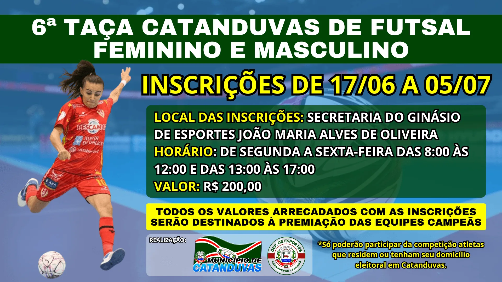 Mas atenção, só poderão participar da competição atletas que residem ou tenham seu domicílio eleitoral em Catanduvas.