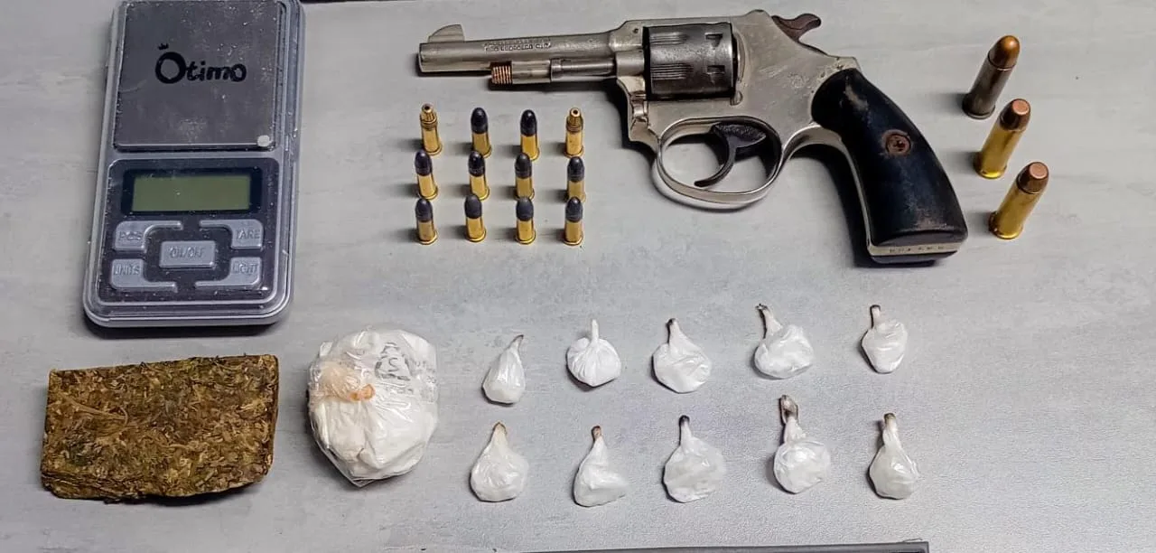 A operação, que cumpriu um mandado de busca e apreensão, encontrou 11 unidades de cocaína, uma porção de maconha, 15 munições de calibres .22mm e .38mm, uma balança de precisão, um revólver calibre .22mm, anotações relacionadas ao tráfico de drogas e um aparelho celular.