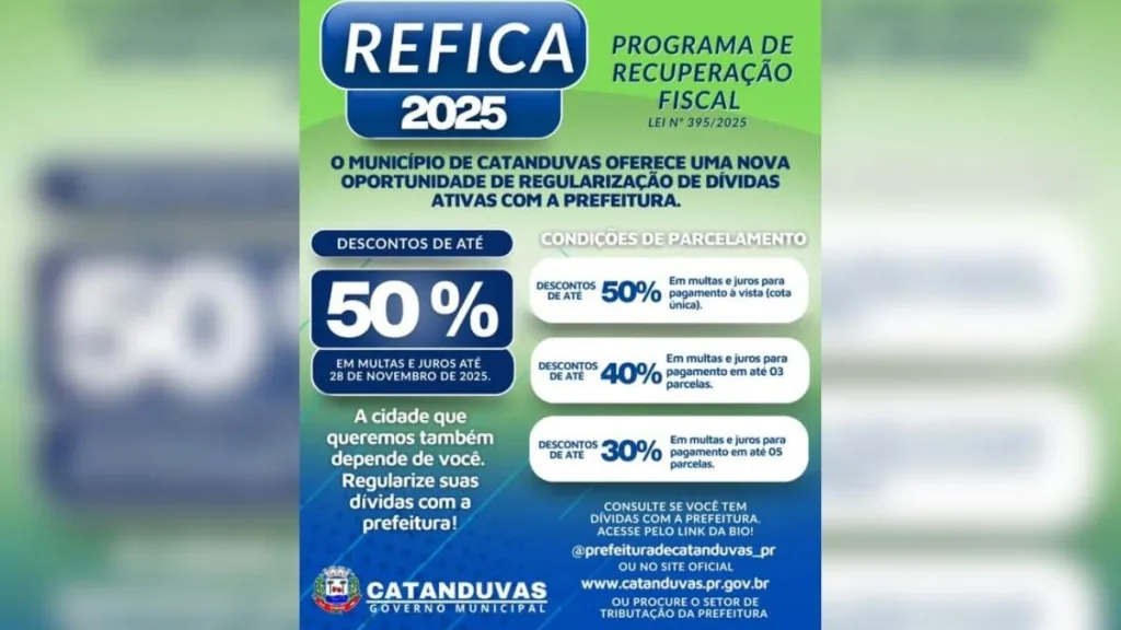A Prefeitura de Catanduvas lançou o Programa de Regularização Fiscal Municipal, instituído pela Lei nº 395/2025, que oferece aos cidadãos uma nova oportunidade para quitar suas dívidas ativas com o município, com descontos de até 50% sobre juros e multas.