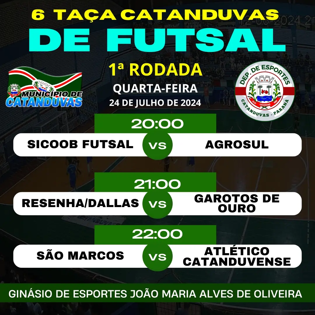 Na próxima quarta-feira, dia 24 de julho de 2024, será realizada a primeira rodada da 6ª Taça Catanduvas de Futsal no Ginásio de Esportes João Maria Alves de Oliveira, com os seguintes confrontos, todos na categoria masculino: