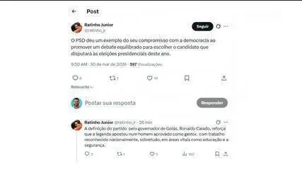 Em sua manifestação, Ratinho Junior destacou que a definição do PSD pelo governador de Goiás, Ronaldo Caiado, “reforça que a legenda apostou num homem aprovado como gestor, com trabalho reconhecido nacionalmente, sobretudo, em áreas vitais como educação e a segurança”. A escolha de Caiado como presidenciável do PSD foi oficializada pelo partido nesta segunda-feira (30).