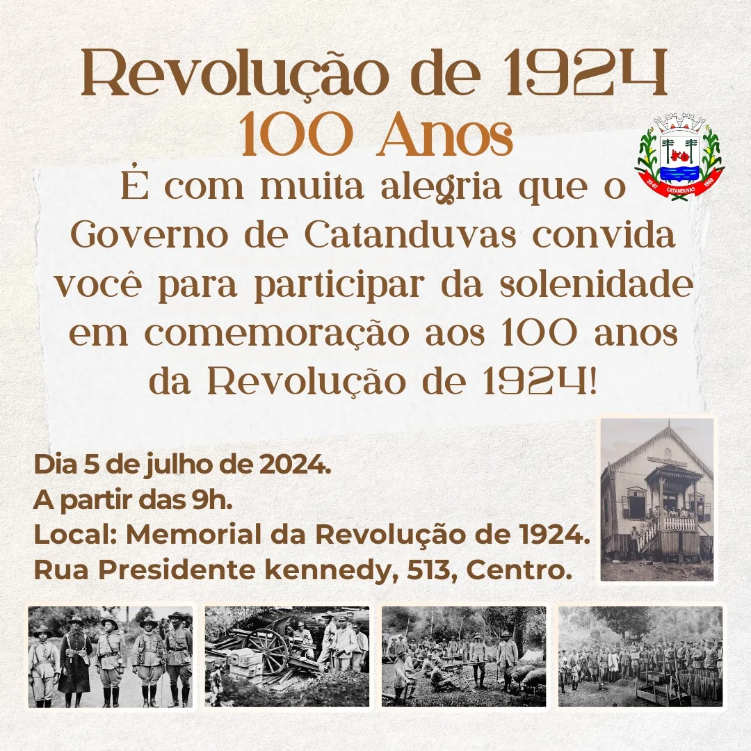 O Governo de Catanduvas, tem a honra de convidar você para participar do Ato Solene em comemoração aos 100 anos da Revolução de 1924, que será realizado no dia 05 de julho (sexta-feira), às 09h da manhã, no Memorial da Revolução de 1924.