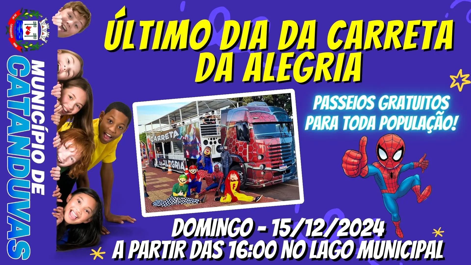 Neste domingo, 15 de dezembro de 2024, acontece o último dia dos passeios da Carreta da Alegria em Catanduvas. A diversão será no Lago Municipal, a partir das 16 horas, com entrada gratuita para toda a população.